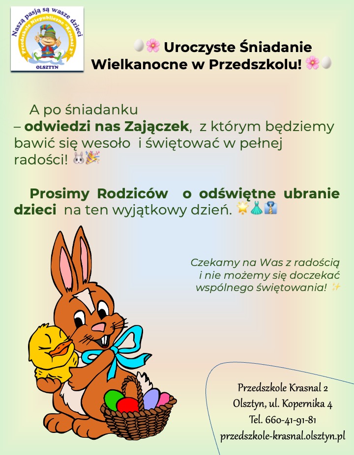 Śniadanie Wielkanocne w Przedszkolu Krasnal – 16 kwietnia 2025 rokPrzez AdministratorKrasnal / 13 kwietnia 2025