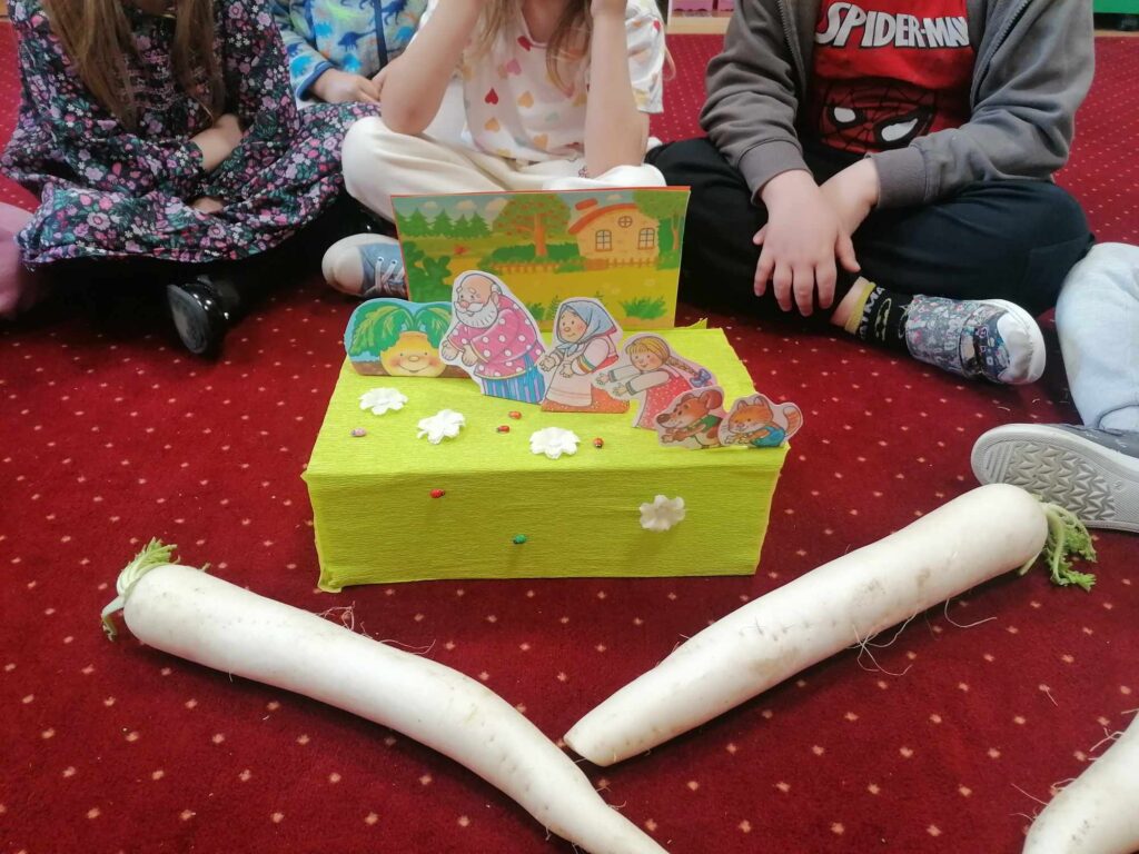 📖 Grupa Mądraczki gościła Rzepę Rozalię na swoich zajęciach, ucząc się poprzez zabawę i aktywnie uczestnicząc w rozmowach o zdrowym odżywianiu.