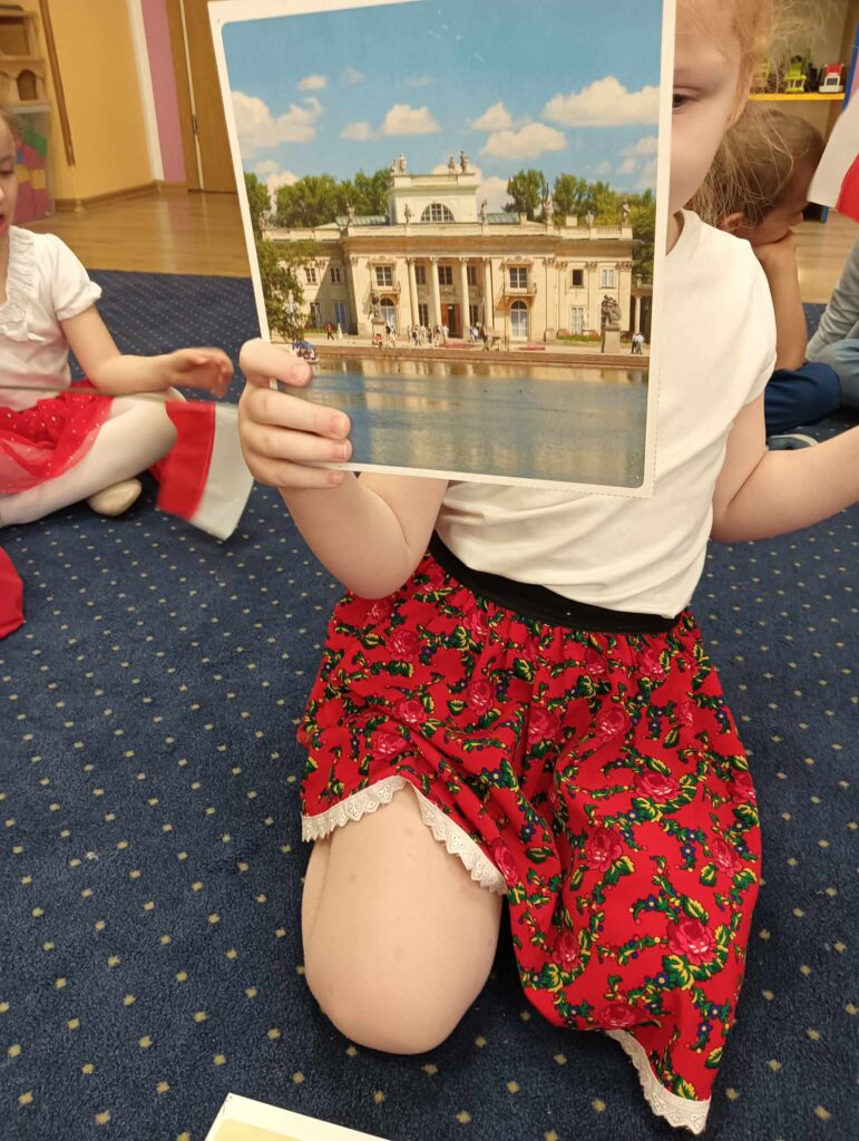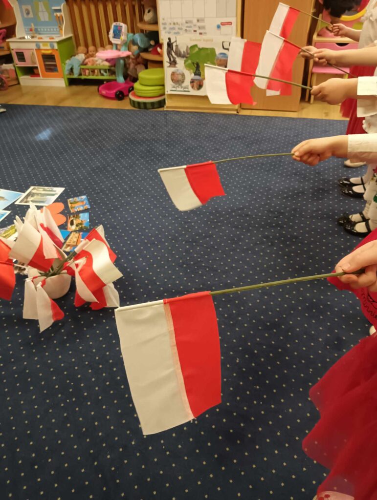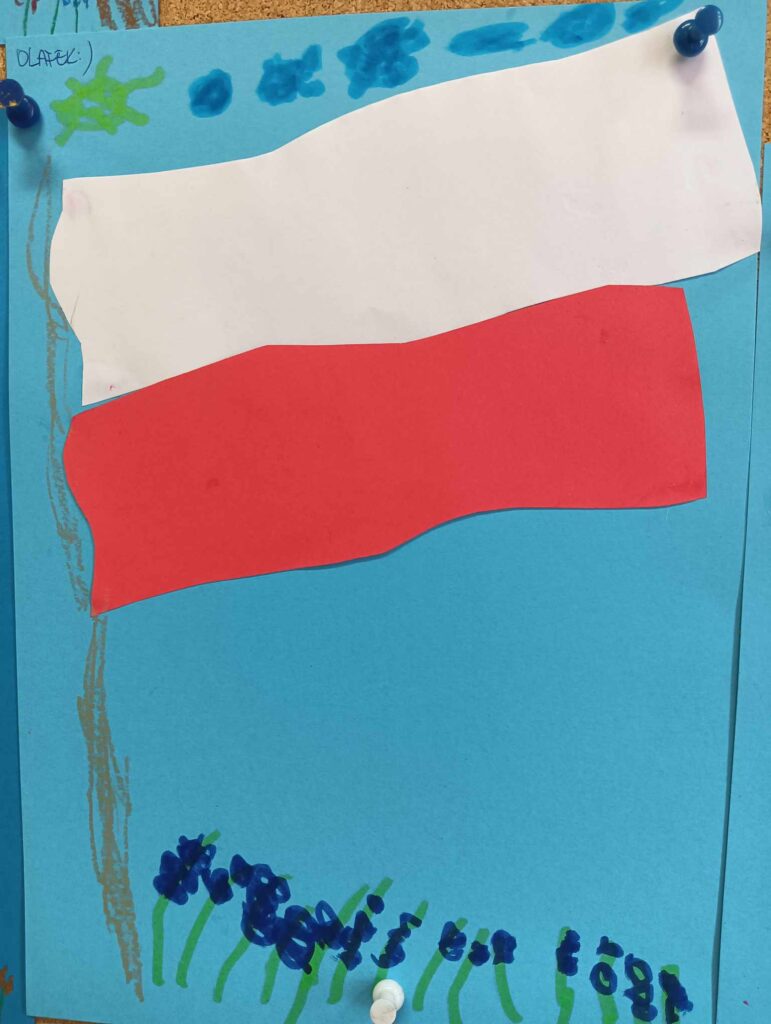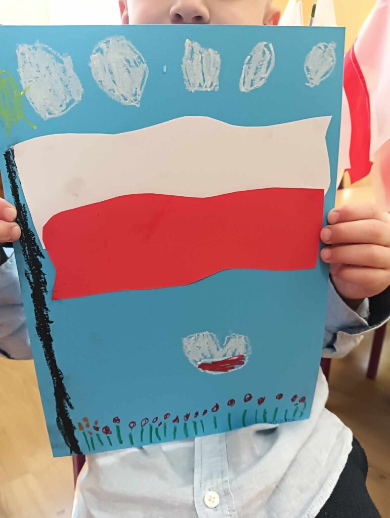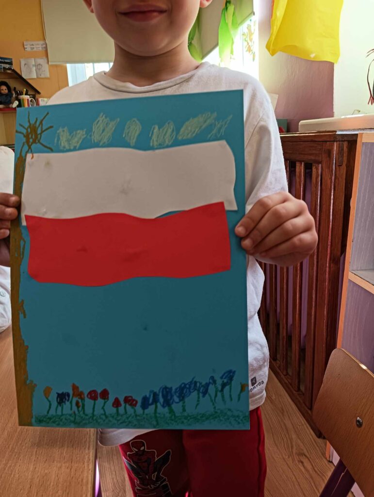 Dzieci poznały symbole narodowe, uczyły się o ich znaczeniu i historii, a także – z ogromną starannością i dumą – wykonały własne flagi Polski. Była to nie tylko okazja do wspólnej zabawy i twórczości, ale przede wszystkim do budowania poczucia tożsamości narodowej już od najmłodszych lat.