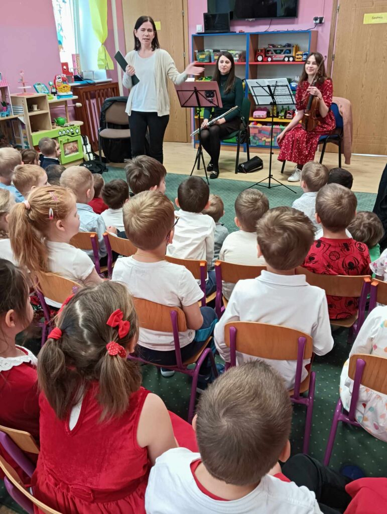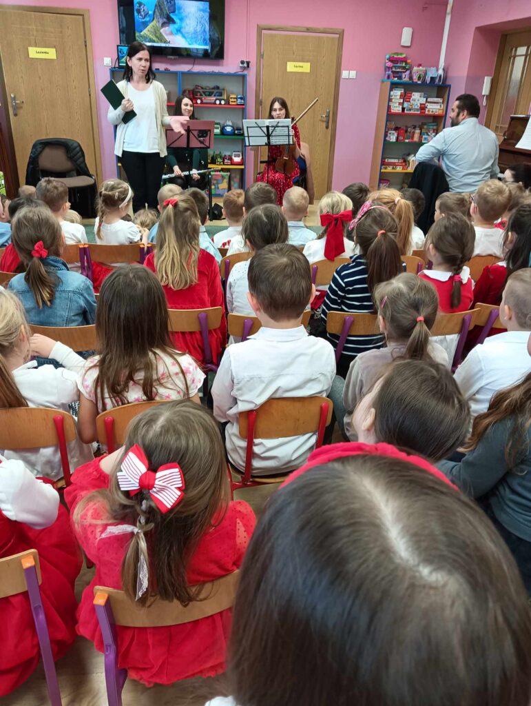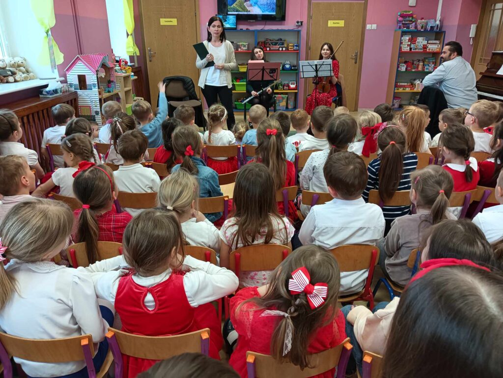 Dzieci miały okazję nie tylko wysłuchać pięknych utworów w profesjonalnym wykonaniu, ale również w symboliczny sposób uczcić barwy narodowe. To wyjątkowe spotkanie nie tylko wprowadziło nas w atmosferę patriotycznego świętowania, ale także stało się okazją do rozwijania wrażliwości muzycznej i kształtowania postaw obywatelskich już od najmłodszych lat.