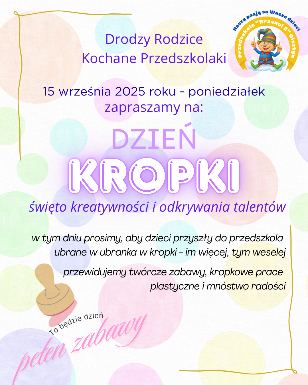 Dzień Kropki w KrasnaluPrzez AdministratorKrasnal / 14 września 2025 15 września Z małej kropki rodzą się wielkie pomysły! #DzieńKropki #Kreatywność #Odwaga #PrzedszkoleKrasnal #NaszaPasjaSąWaszedziecihttps://przedszkole-krasnal.olsztyn.pl/wp-content/uploads/2025/09/czym-jest-dzien-kropki.mp4