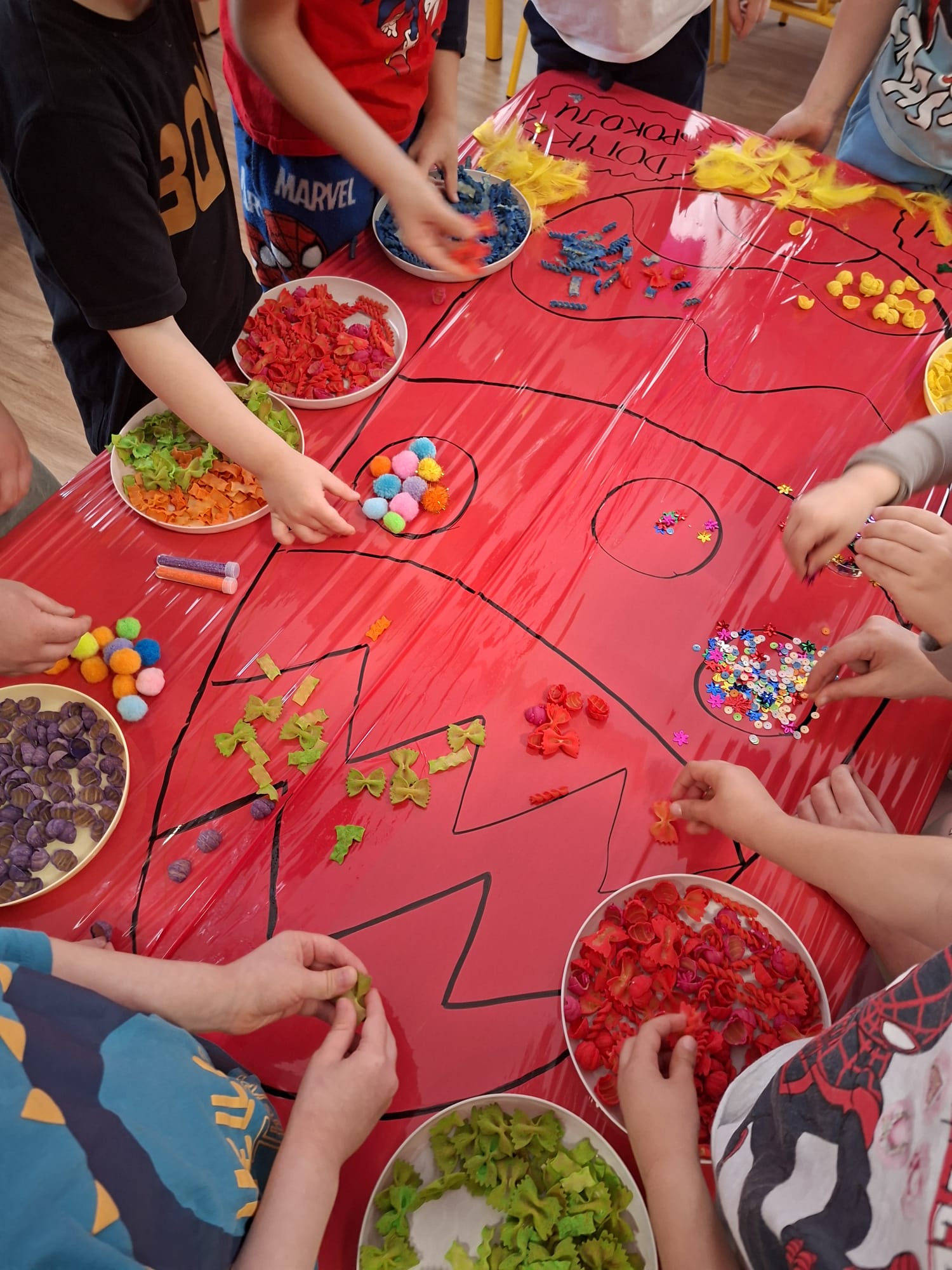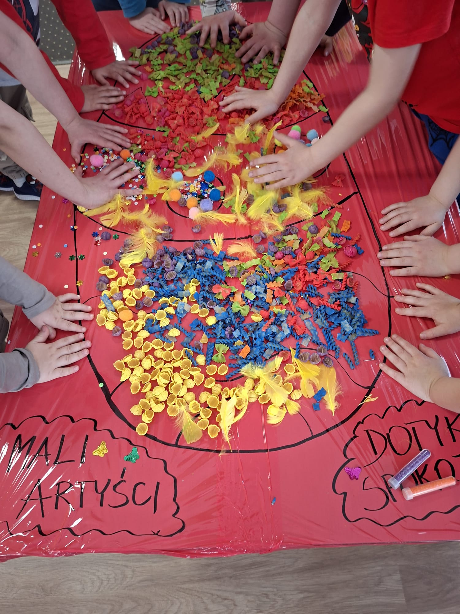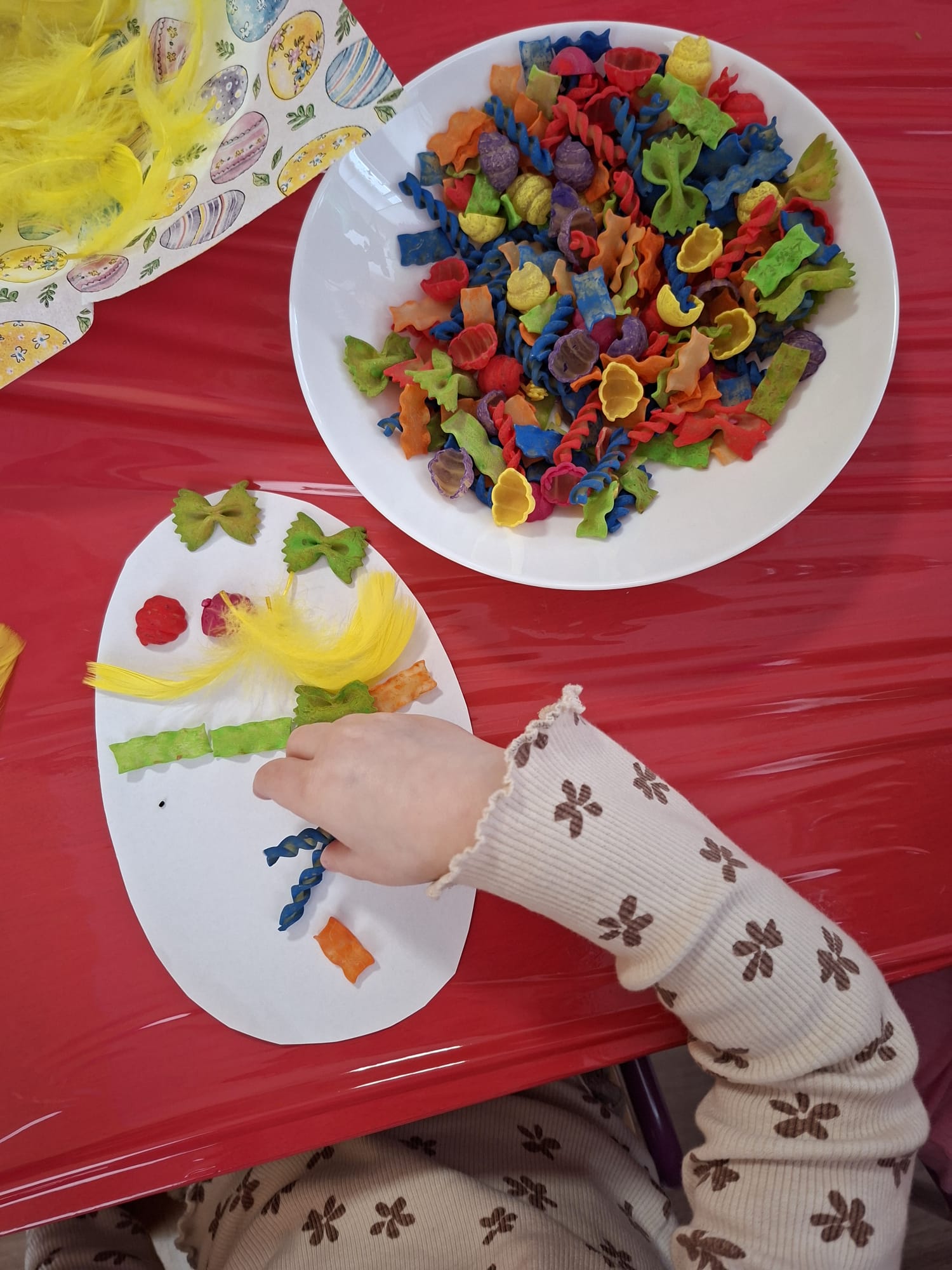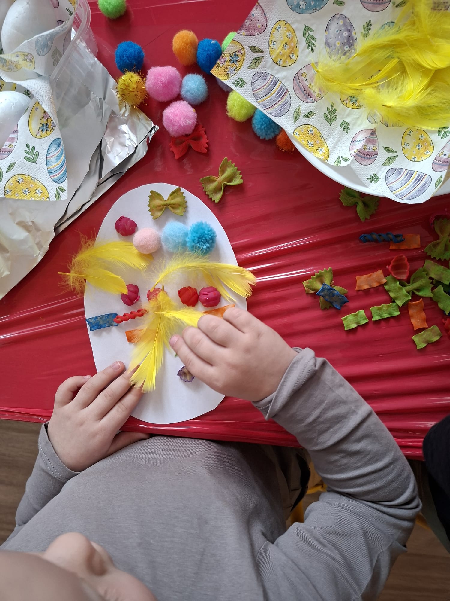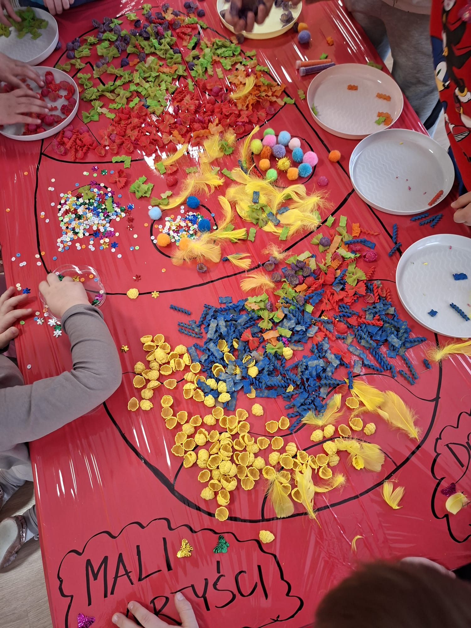 Tworzyliśmy wyjątkowe pisanki z kolorowego makaronu, mięciutkich pomponików i barwnej posypki 🎨🌈 Każda praca była odzwierciedleniem indywidualności dziecka – pełna odwagi, fantazji i swobody twórczej 🐣✨