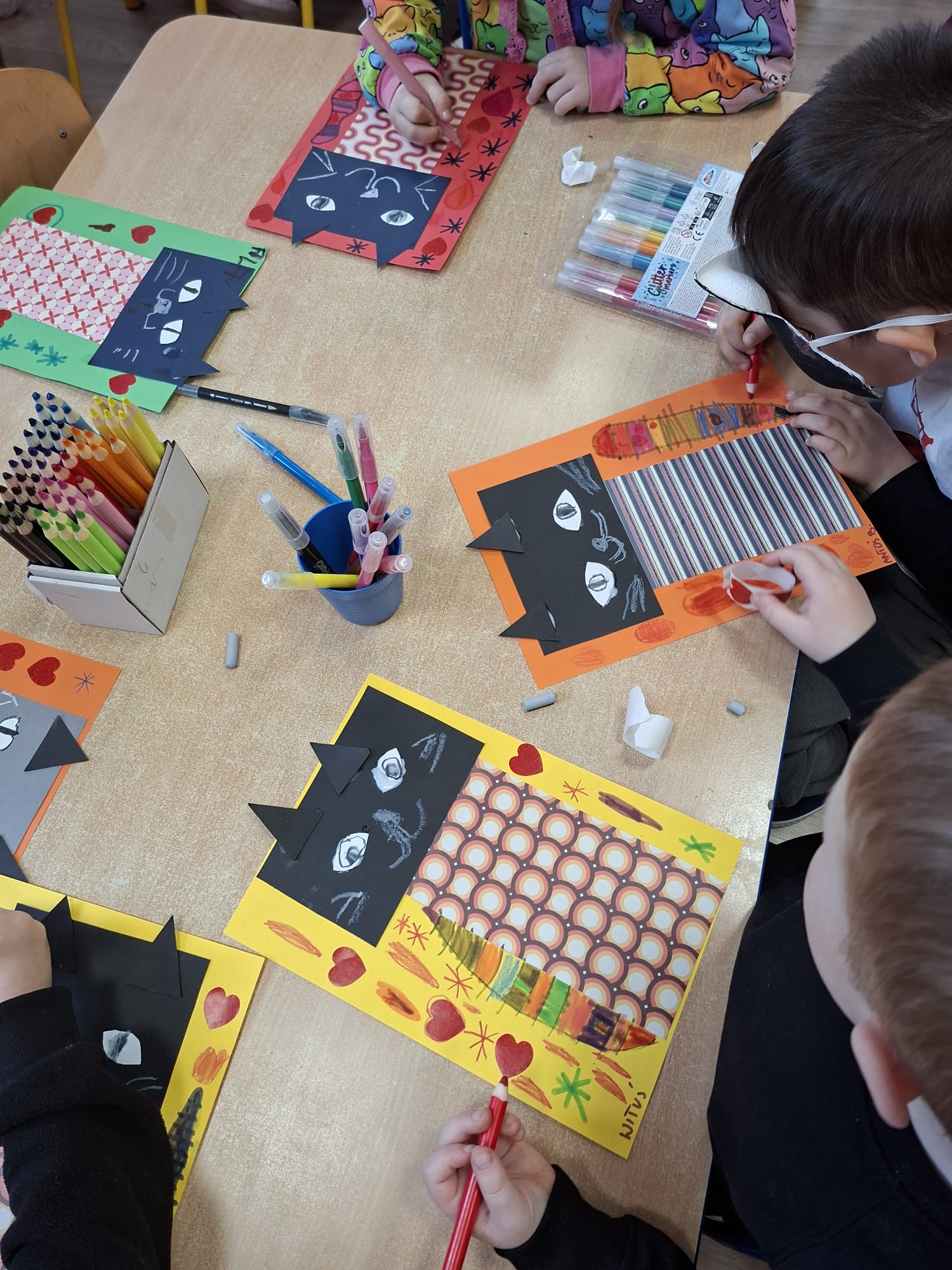 Nie zabrakło także twórczej części dnia – Krasnale z zapałem wykonywały kocie prace plastyczne, rozwijając swoją wyobraźnię i zdolności manualne 🎨🐱🎨🐱 Każda praca była wyjątkowa i pełna dziecięcej radości 😻🐾🐱