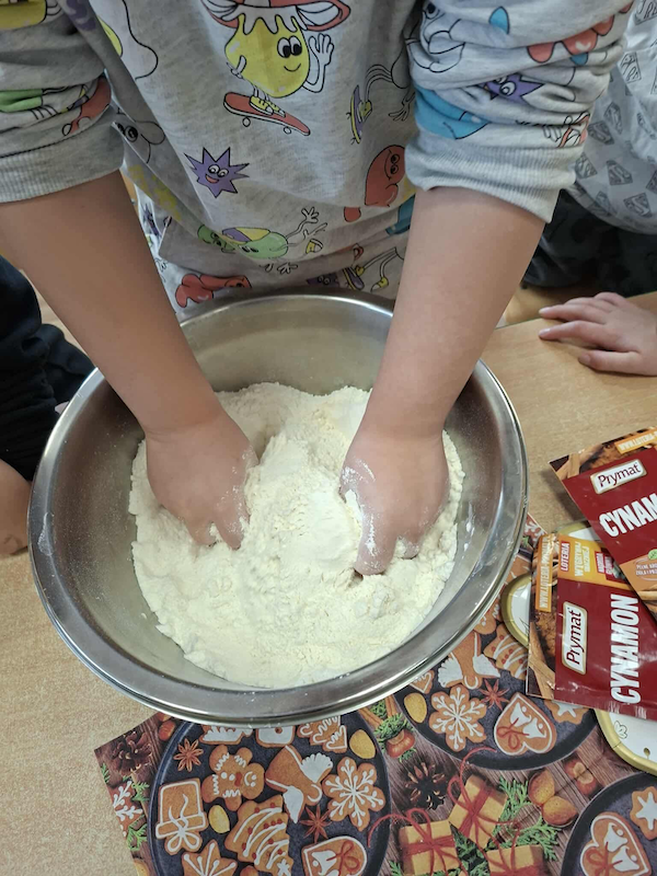 Nasze Pracusie zanurzyły dziś dłonie w wyjątkowej, świątecznej kompozycji zapachów i tekstur, tworząc pachnące ozdoby z masy cynamonowej z dodatkiem olejku migdałowego.