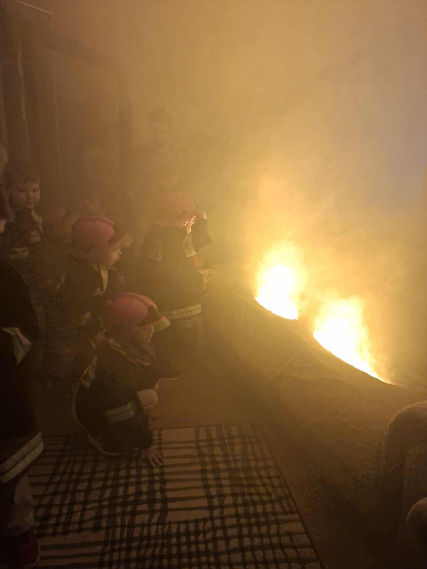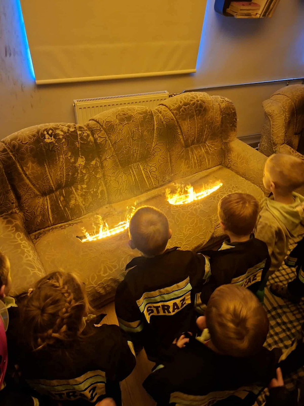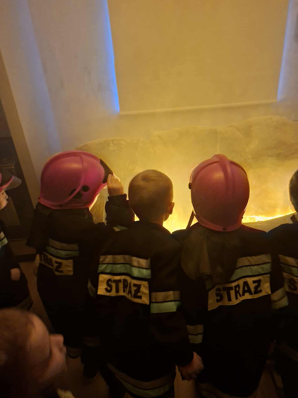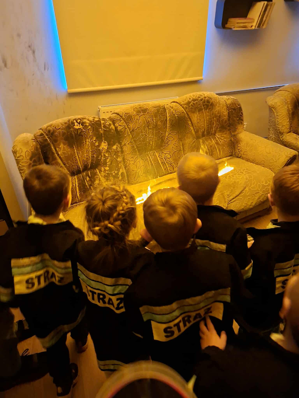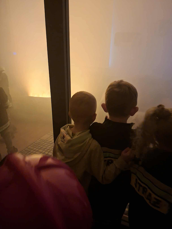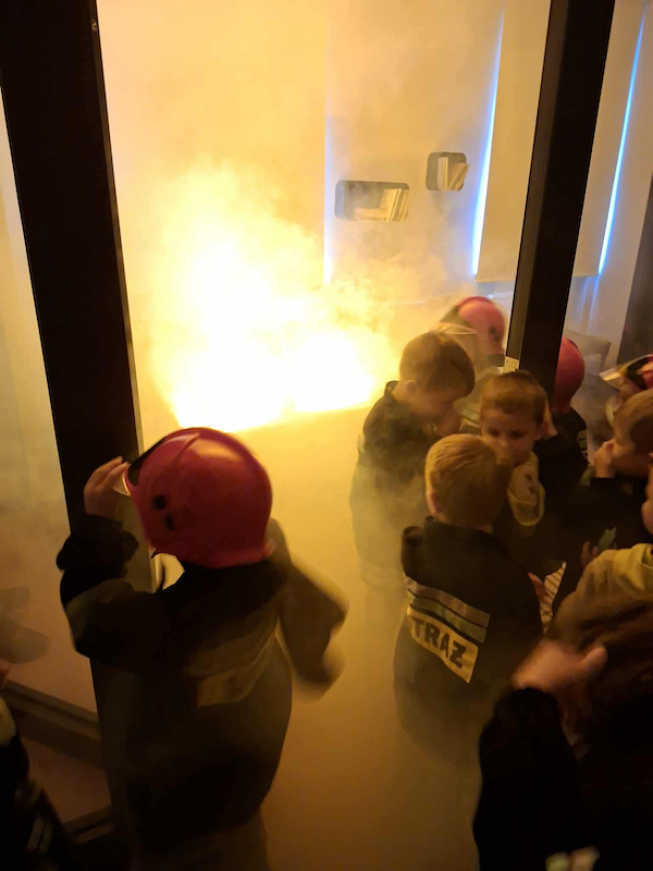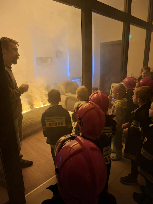 Zajęcia prowadzone przez strażaków łączyły naukę z zabawą — były filmy, rozmowy i praktyczne ćwiczenia. 👩🚒👨🚒 Największe wrażenie zrobiła symulacja prawdziwego pożaru w specjalnie przygotowanym pomieszczeniu, która pozwoliła dzieciom lepiej zrozumieć, jak groźne potrafi być to zjawisko i jak ważna jest rozwaga. 🔥