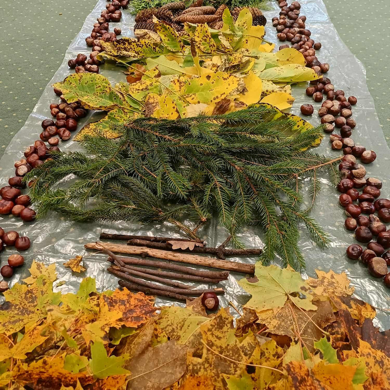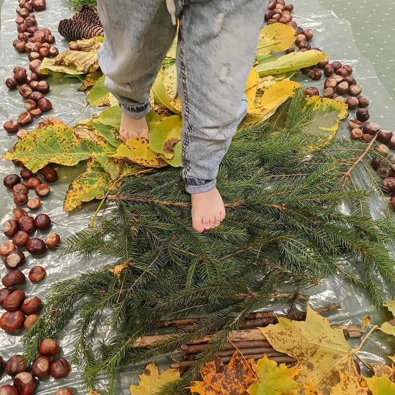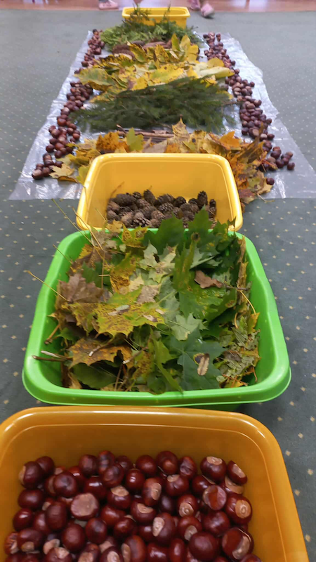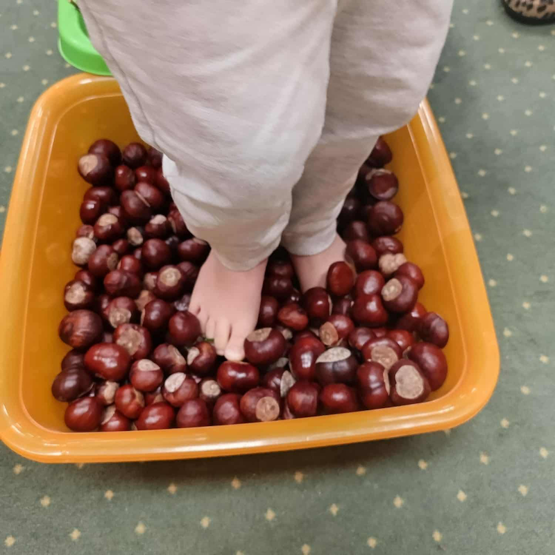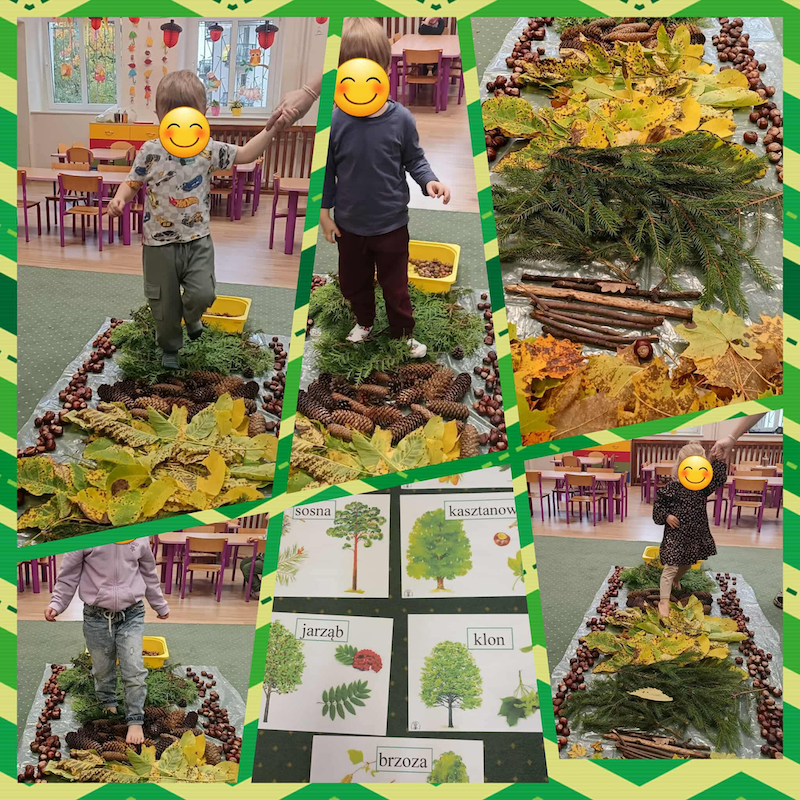 Krasnale z wszystkich grup uczestniczyły w jesiennych zabawach sensorycznych – dotykały, wąchały, porównywały kolory i faktury liści, szyszek, kasztanów i kory drzew 🌰🍂🌾.