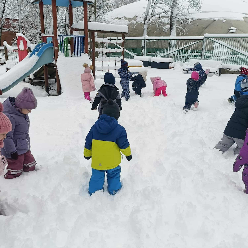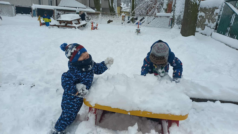 Dzieci lepiły pierwsze bałwanki, robiły ślady na śniegu, tworzyły zimowe torowiska i bawiły się w śnieżne zabawy, które rozwijają sprawność, wyobraźnię i współpracę w grupie. Było dużo śmiechu, rumieńców i tej wyjątkowej zimowej energii, którą dzieci potrafią wydobyć z każdego dnia.
