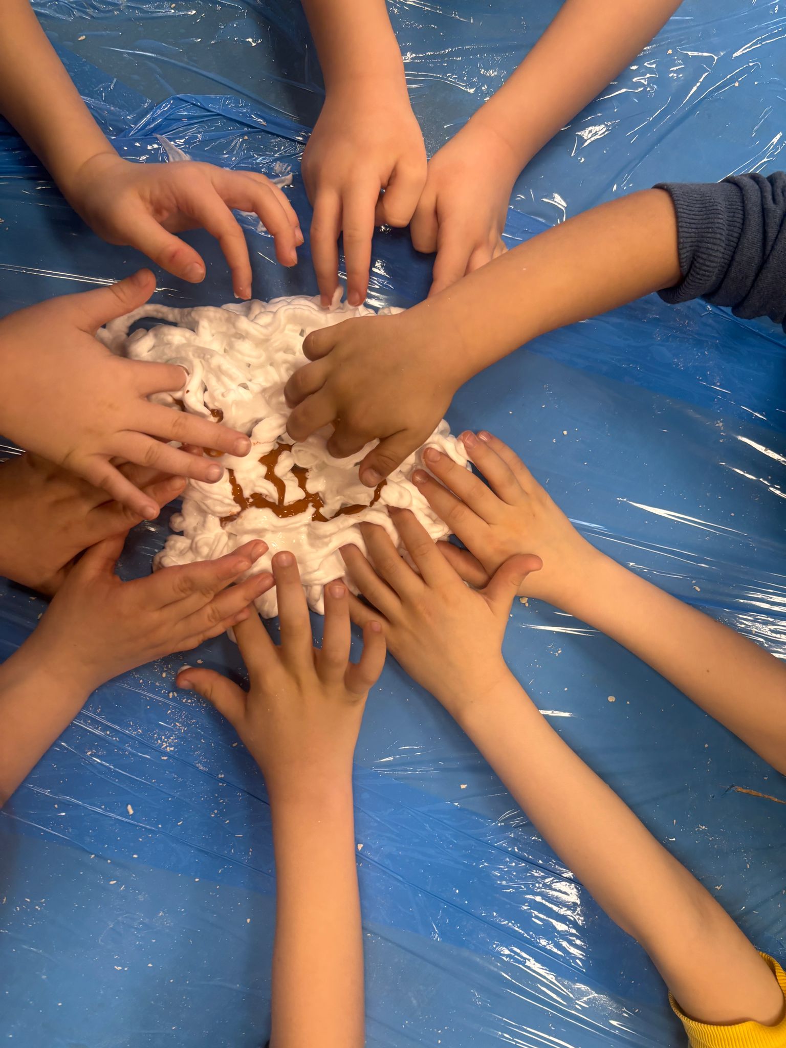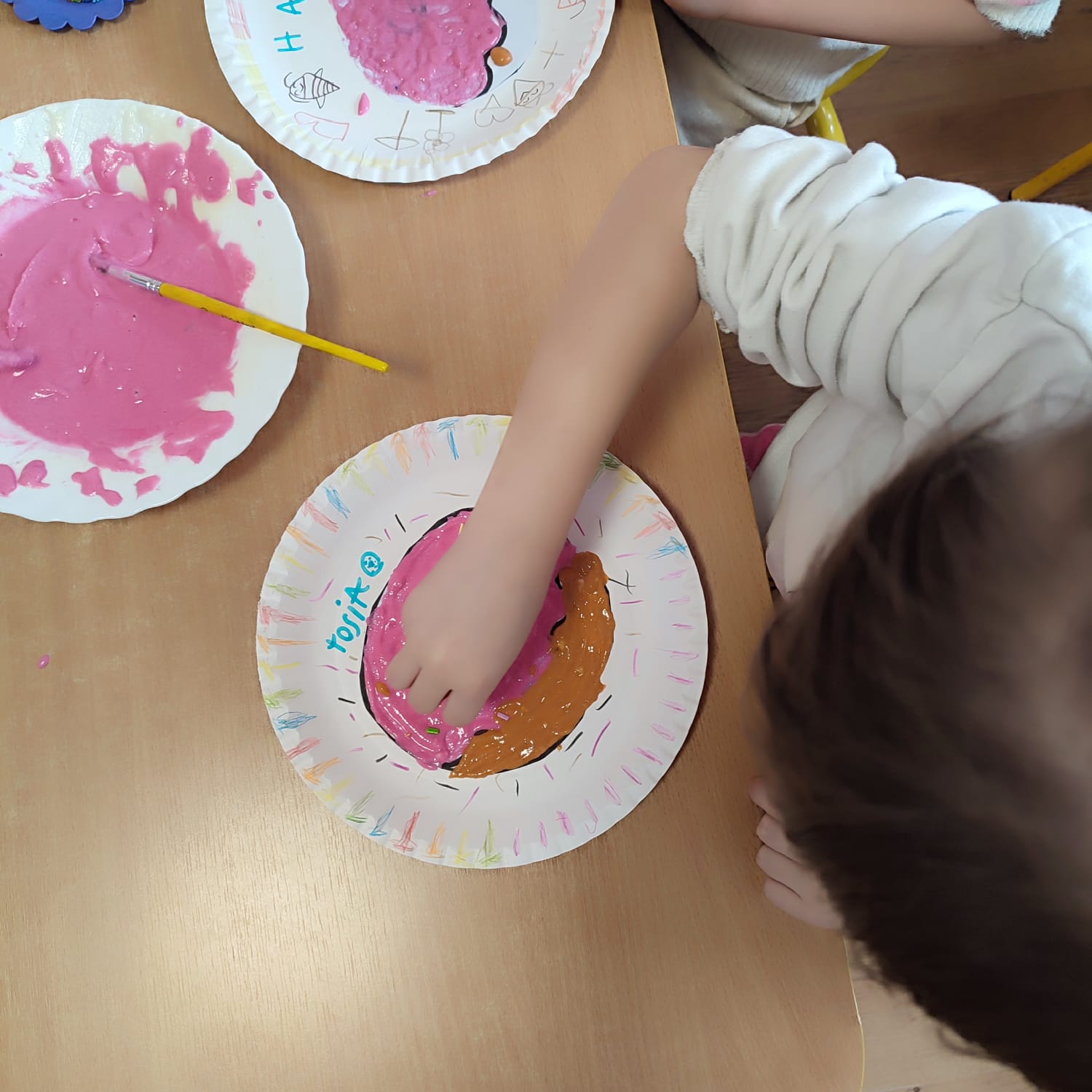 Po powrocie do przedszkola rozpoczęła się prawdziwa eksplozja kreatywności! 🎨🖐️ Krasnale z ogromnym zaangażowaniem tworzyły pączki z rosnącej farby – było kolorowo, sensorycznie i bardzo radośnie! Każde dziecko mogło eksperymentować, dotykać, mieszać i obserwować, jak powstają małe dzieła sztuki przypominające słodkie wypieki 🍩🎨🍩🎨🍩