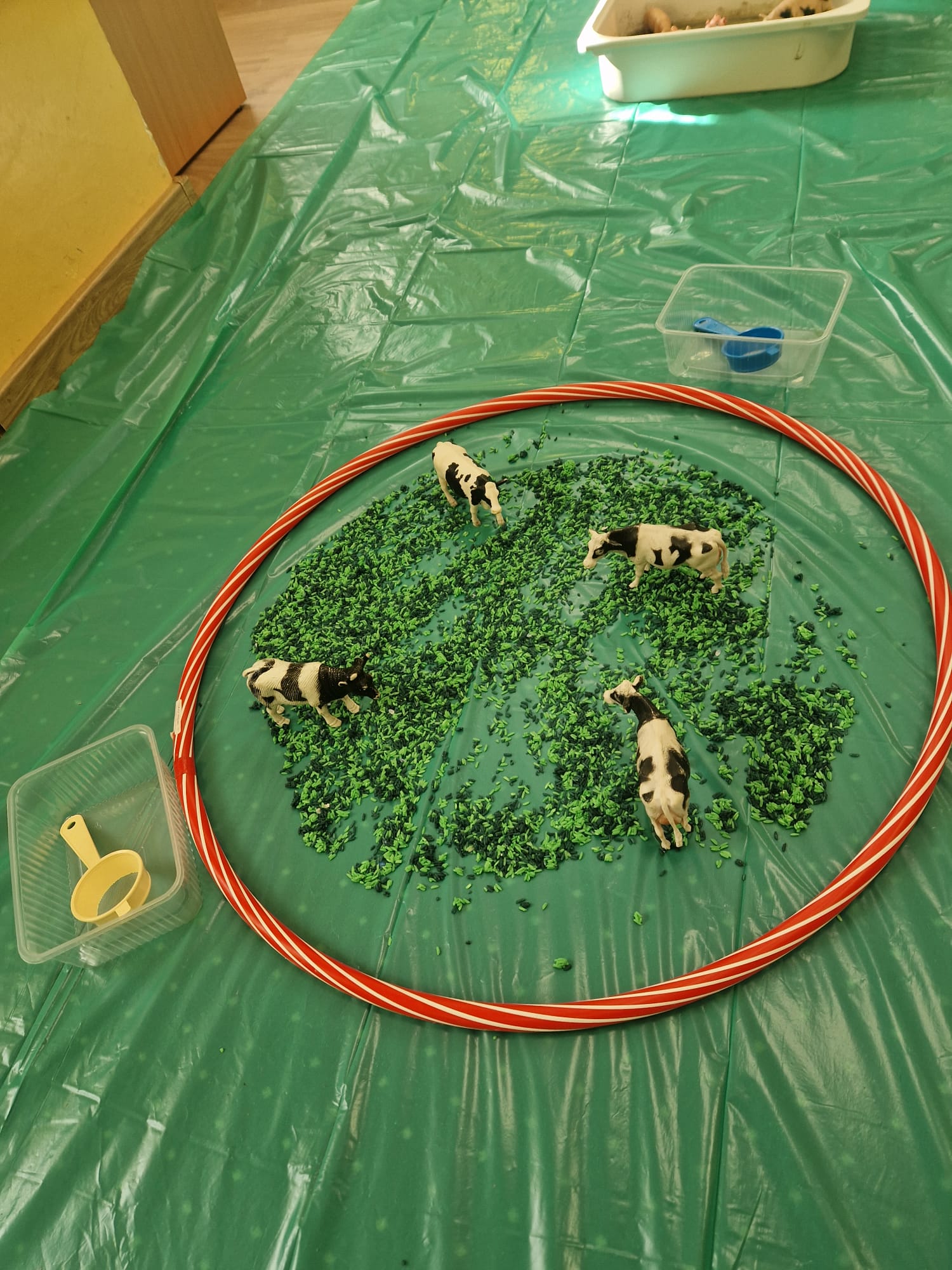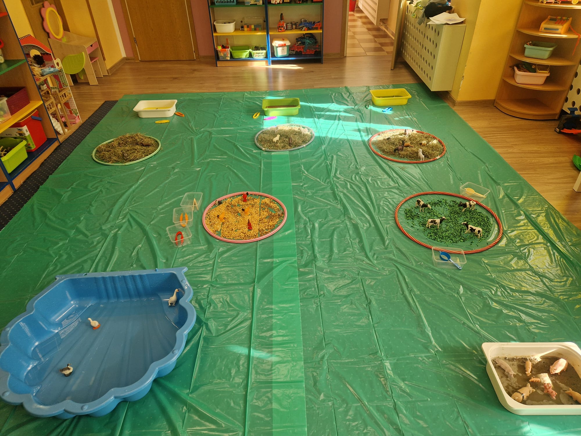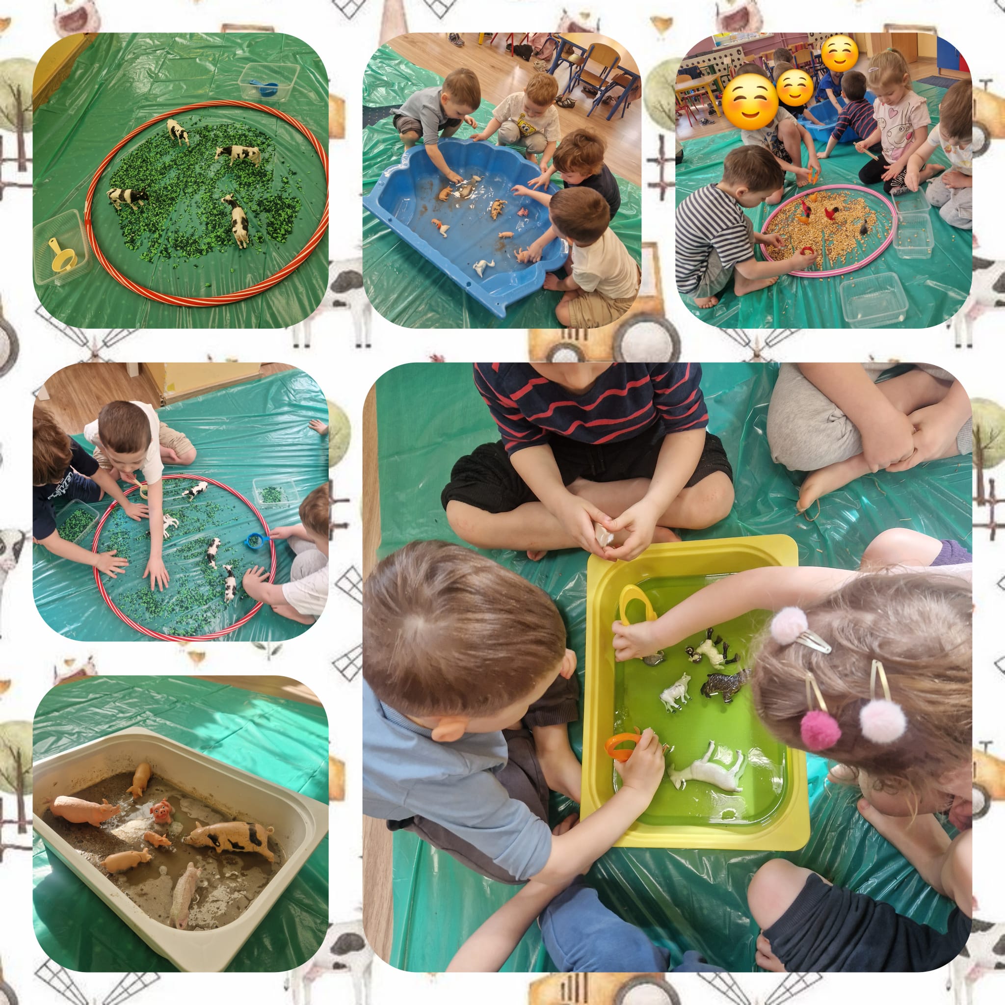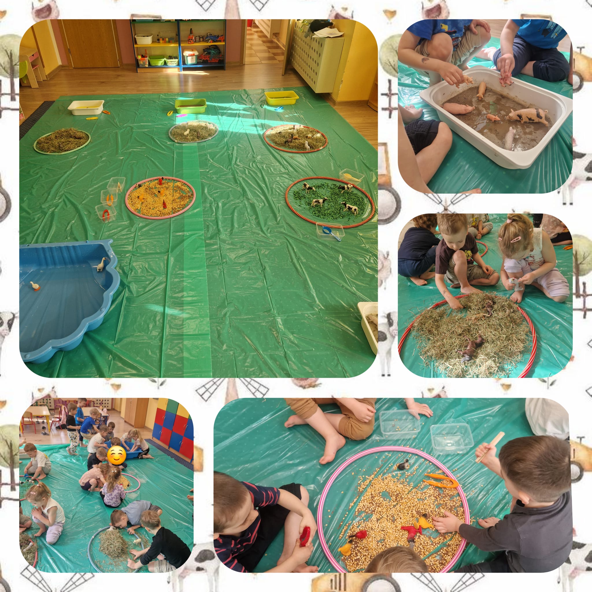 🐑 dzieci poznawały zwierzęta poprzez dotyk i zabawę 🌾 zanurzały rączki w naturalnych materiałach – ziarnach, sianie i ziemi 🐄 odkrywały różne faktury, zapachy i struktury 😊 rozwijały wyobraźnię, swobodę działania i radość z odkrywania