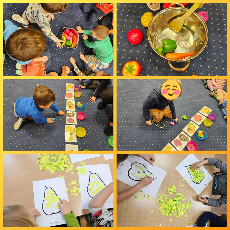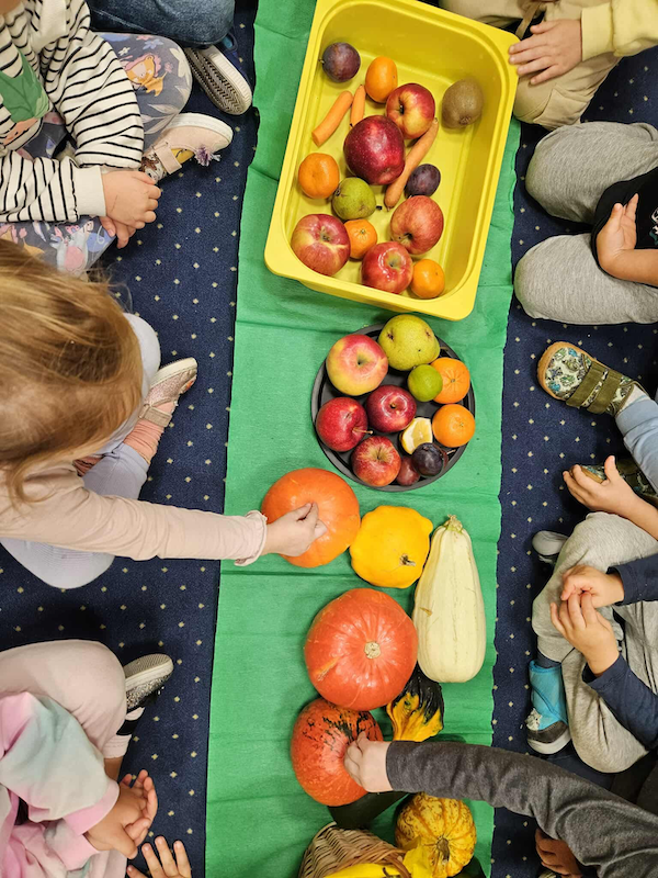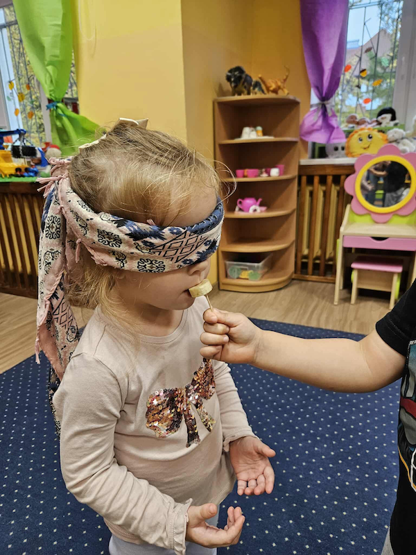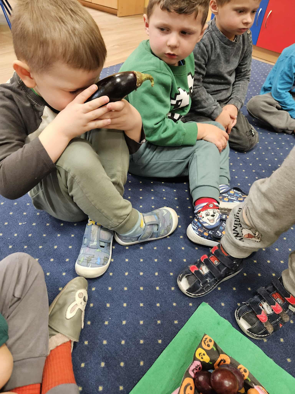 Podczas zajęć nie zabrakło wspólnej degustacji, rozmów o ulubionych smakach i zabaw sensorycznych, które pobudzały wyobraźnię i ciekawość świata dzieci 🌰🍐🌽.