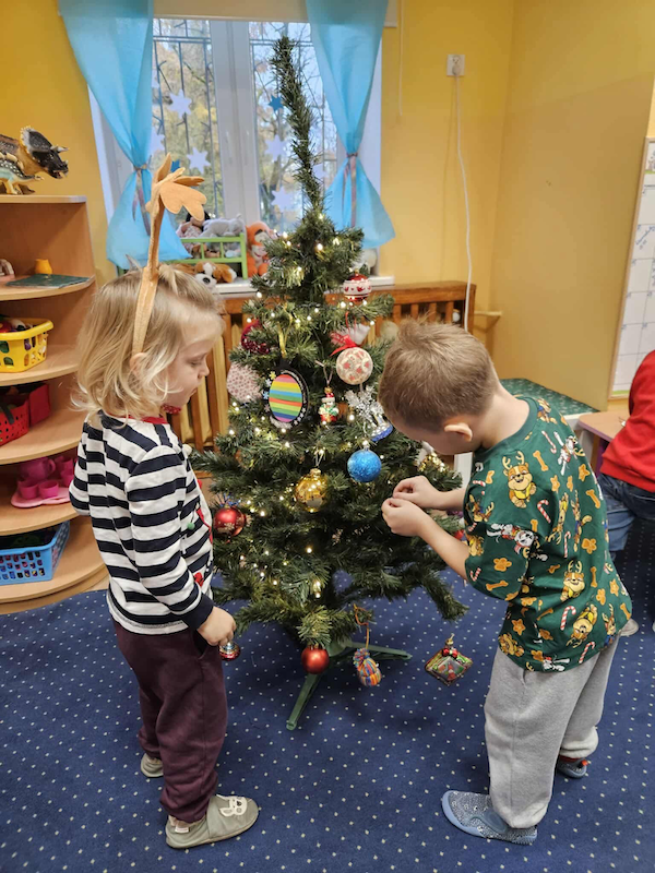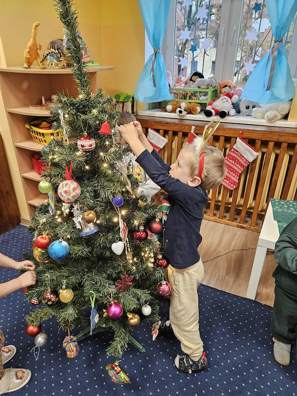 Ubieranie choinki to jeden z tych momentów, na który wszystkie przedszkolaki czekają z ogromną niecierpliwością. „Wesołki” z wielkim zapałem przystąpiły do zawieszania ozdób, a każda z nich wnosiła na choinkę odrobinę dziecięcej radości i świątecznej energii.