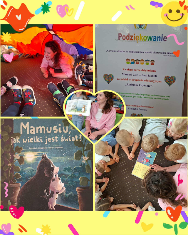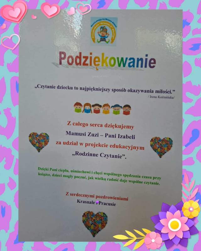 Serdecznie dziękujemy Mamusi Zuzi – p. Izabeli za magiczne chwile spędzone z książką podczas rodzinnego czytania u Krasnali Pracusiow w naszym przedszkolu. To był wyjątkowy czas, pełen radości, ciepła i wspólnego odkrywania świata literatury
