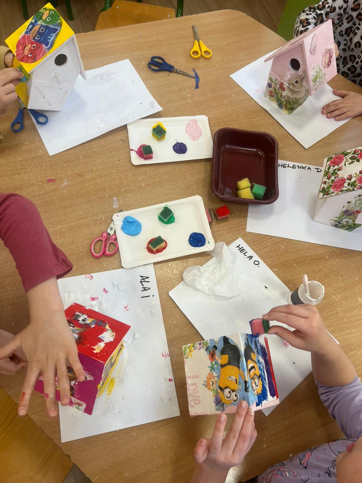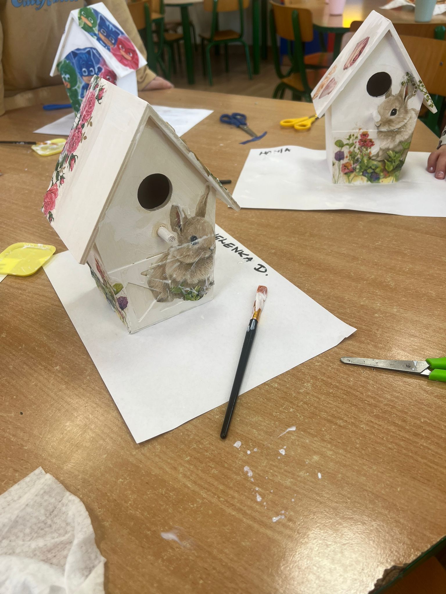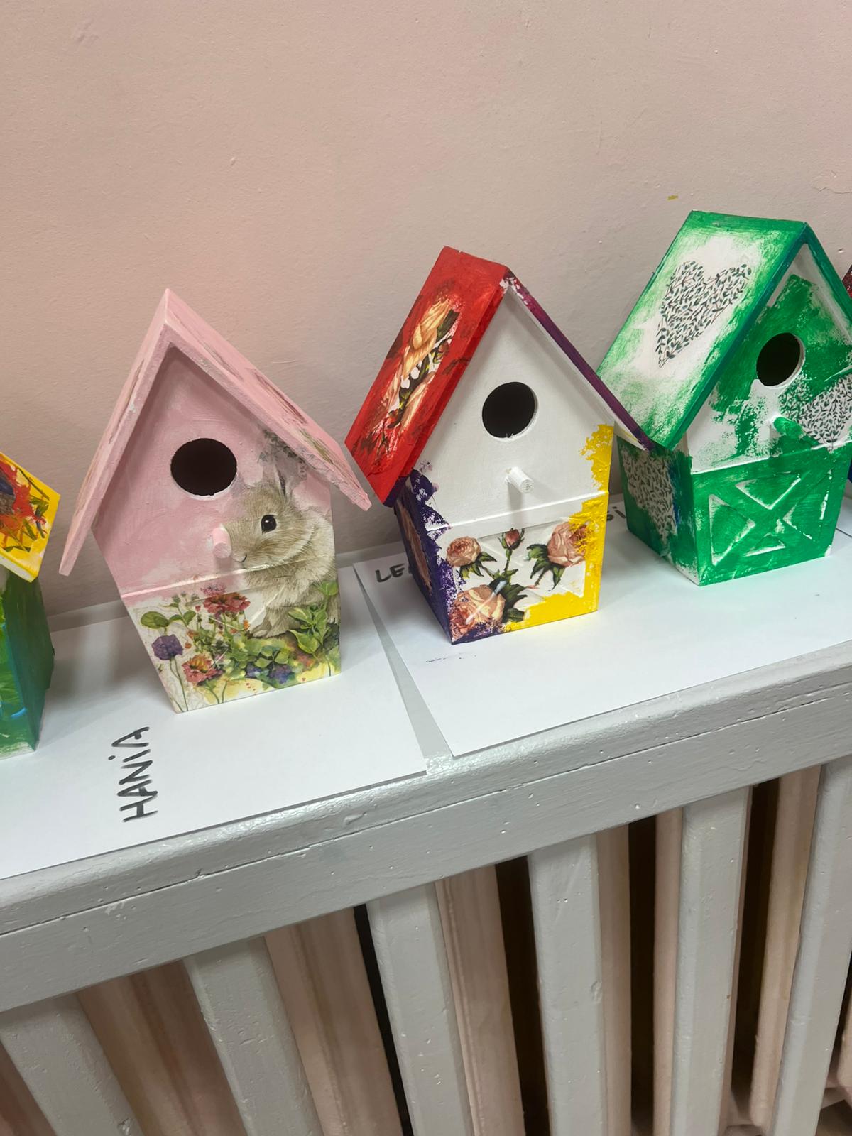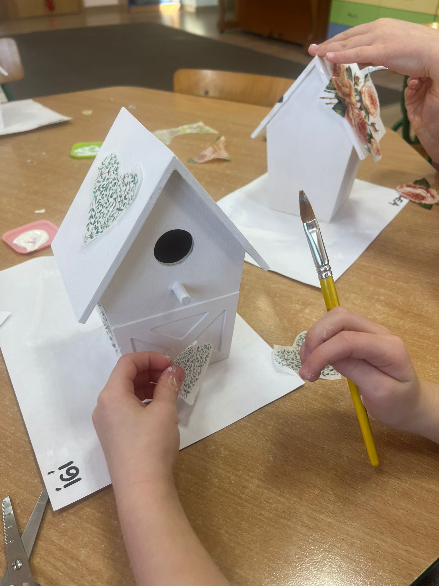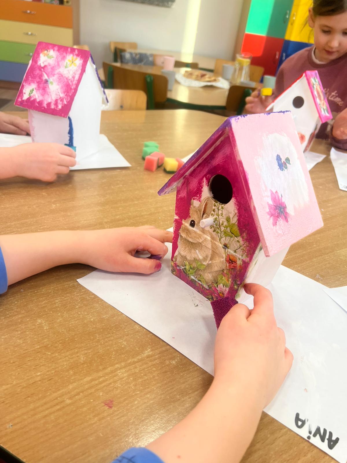Podczas zajęć rękodzieła powstały piękne, drewniane budki dla ptaków, ozdabiane techniką decoupage 🎨🖌️ Każda z nich to małe dzieło sztuki – pełne kolorowych kwiatów, wiosennych motywów i niepowtarzalnej dziecięcej wyobraźni 🌸🌈