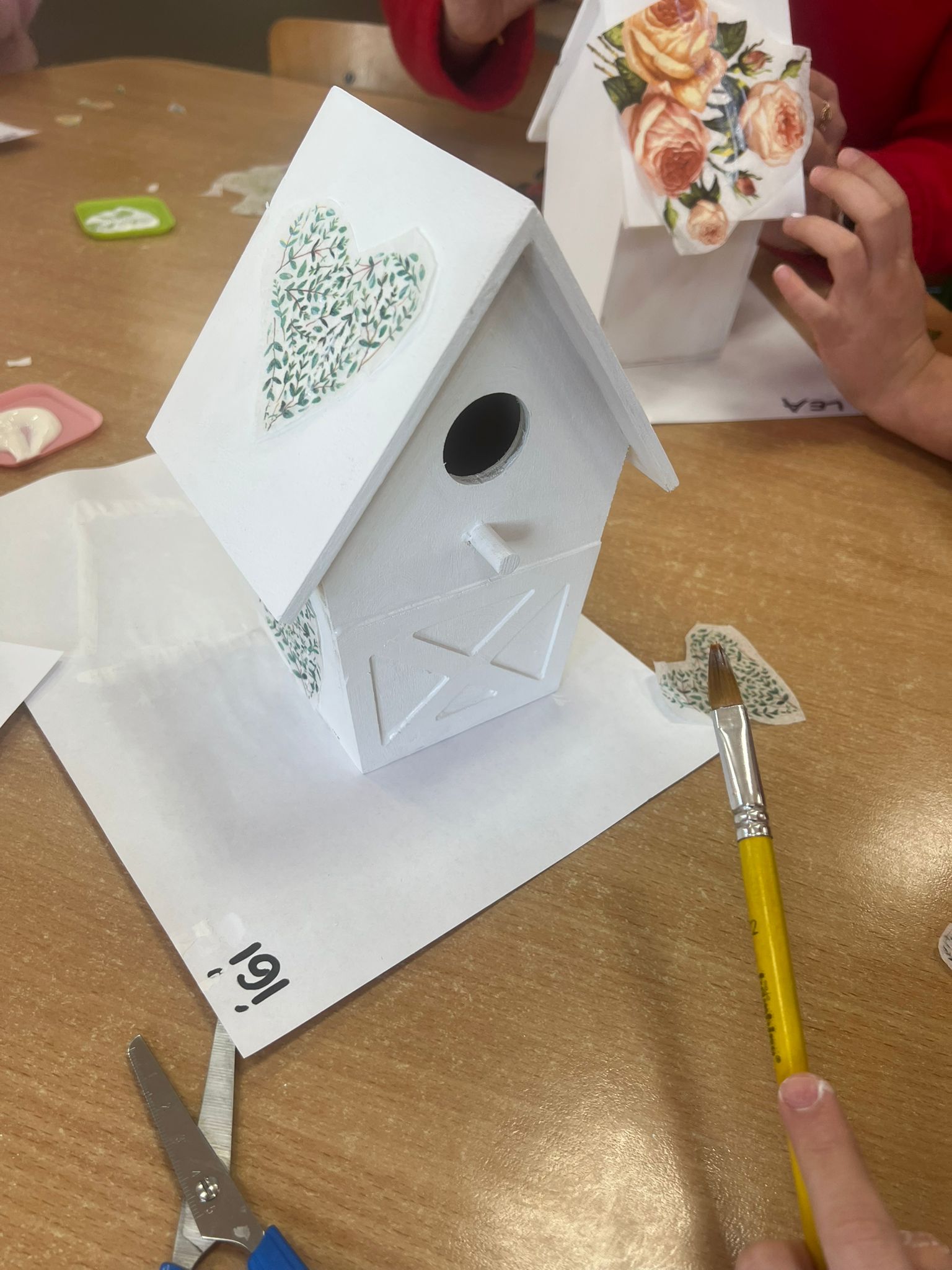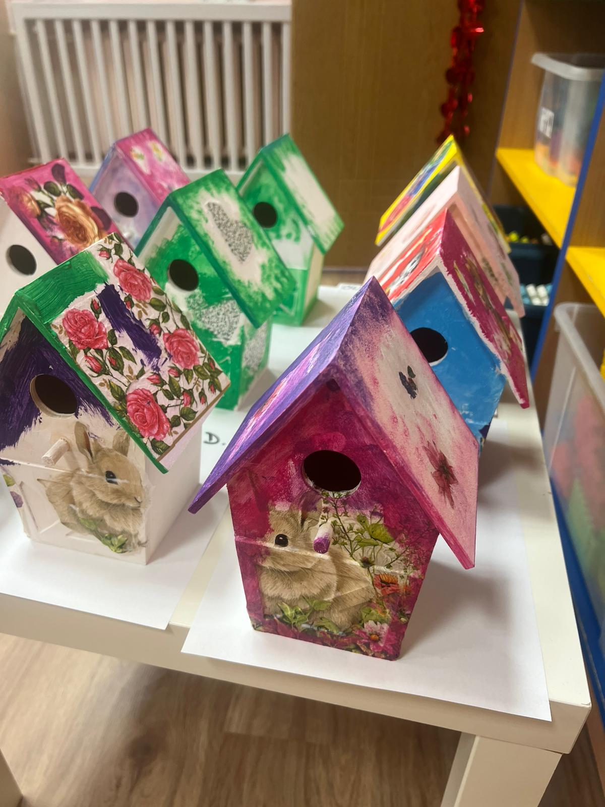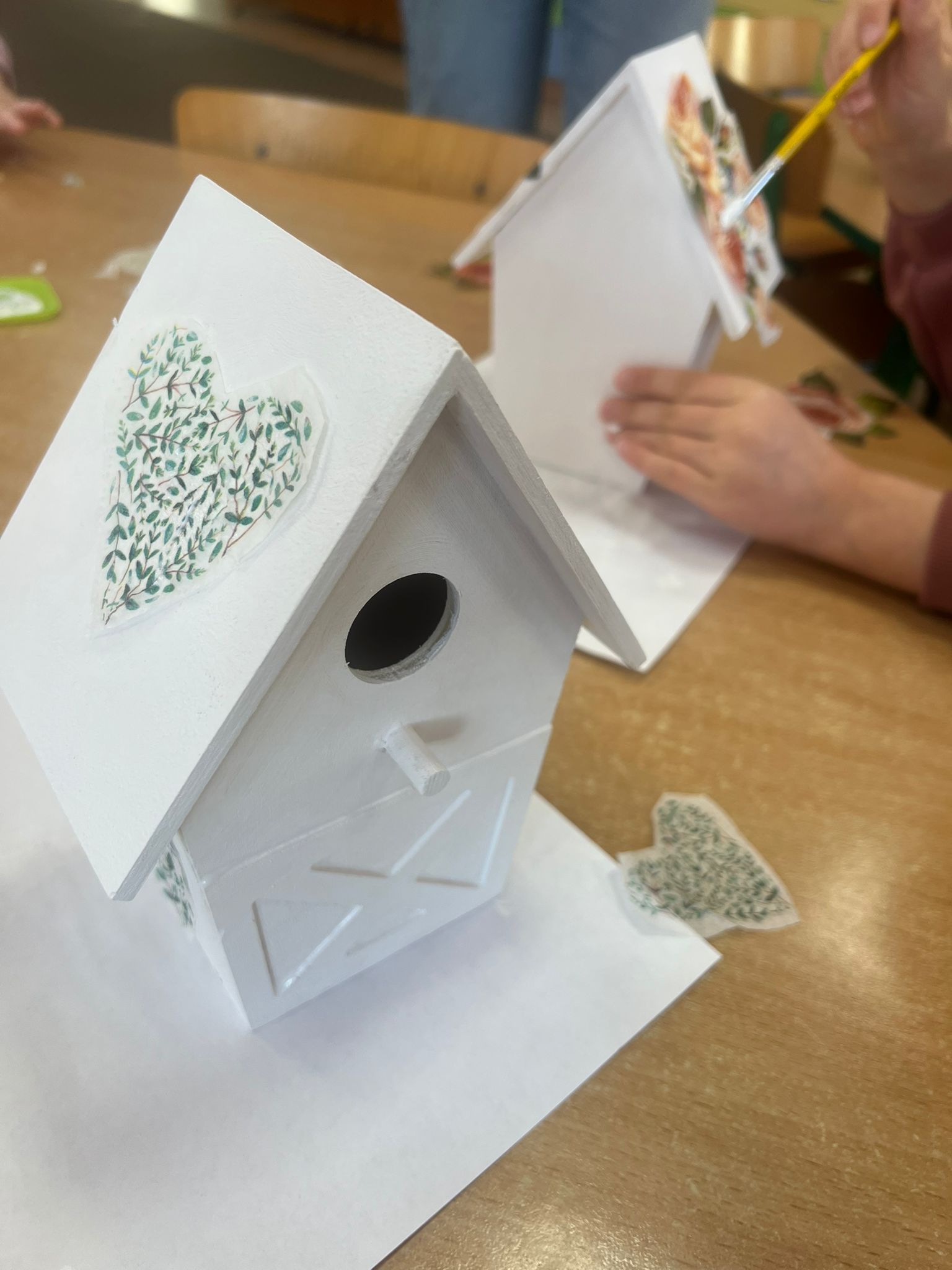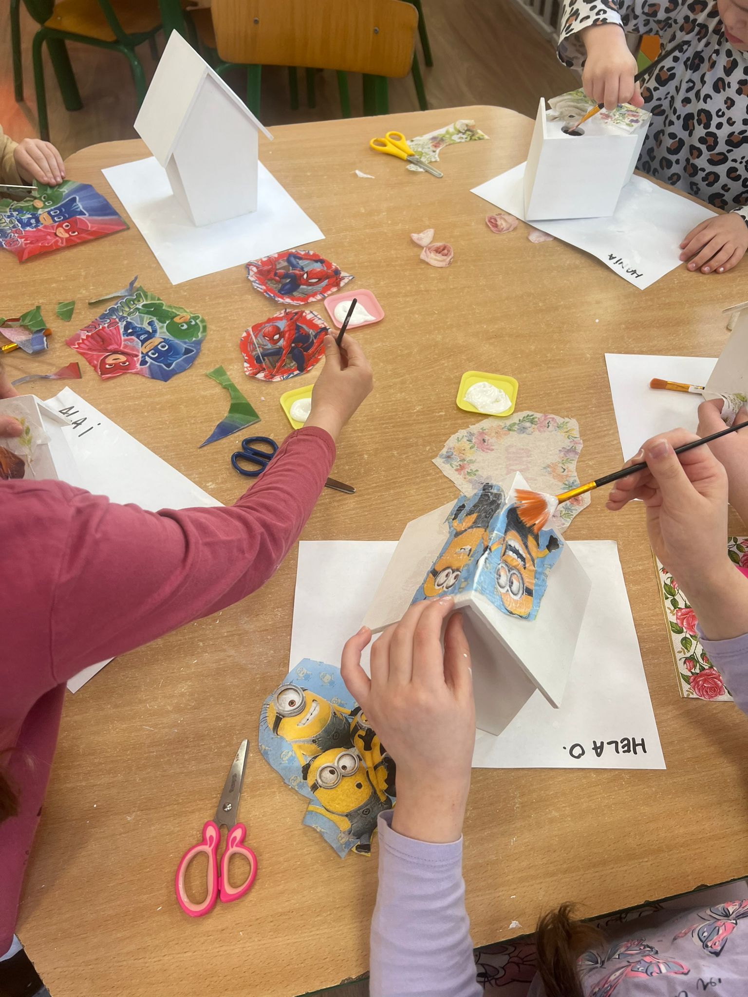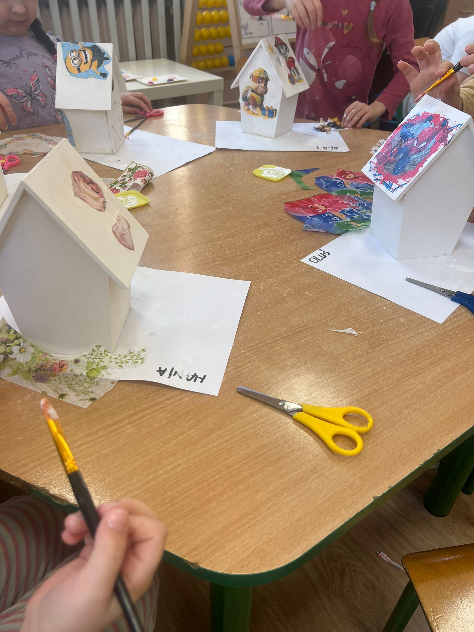 Podczas zajęć rękodzieła powstały piękne, drewniane budki dla ptaków, ozdabiane techniką decoupage 🎨🖌️ Każda z nich to małe dzieło sztuki – pełne kolorowych kwiatów, wiosennych motywów i niepowtarzalnej dziecięcej wyobraźni 🌸🌈