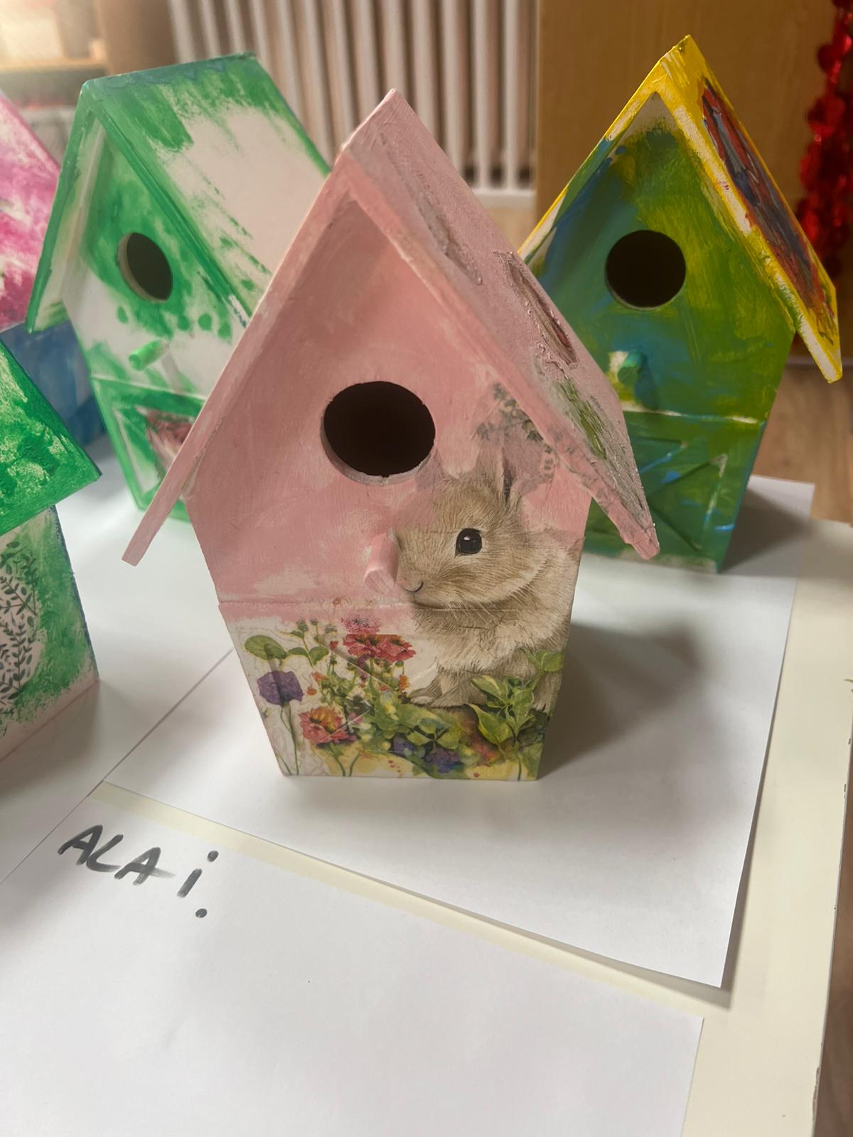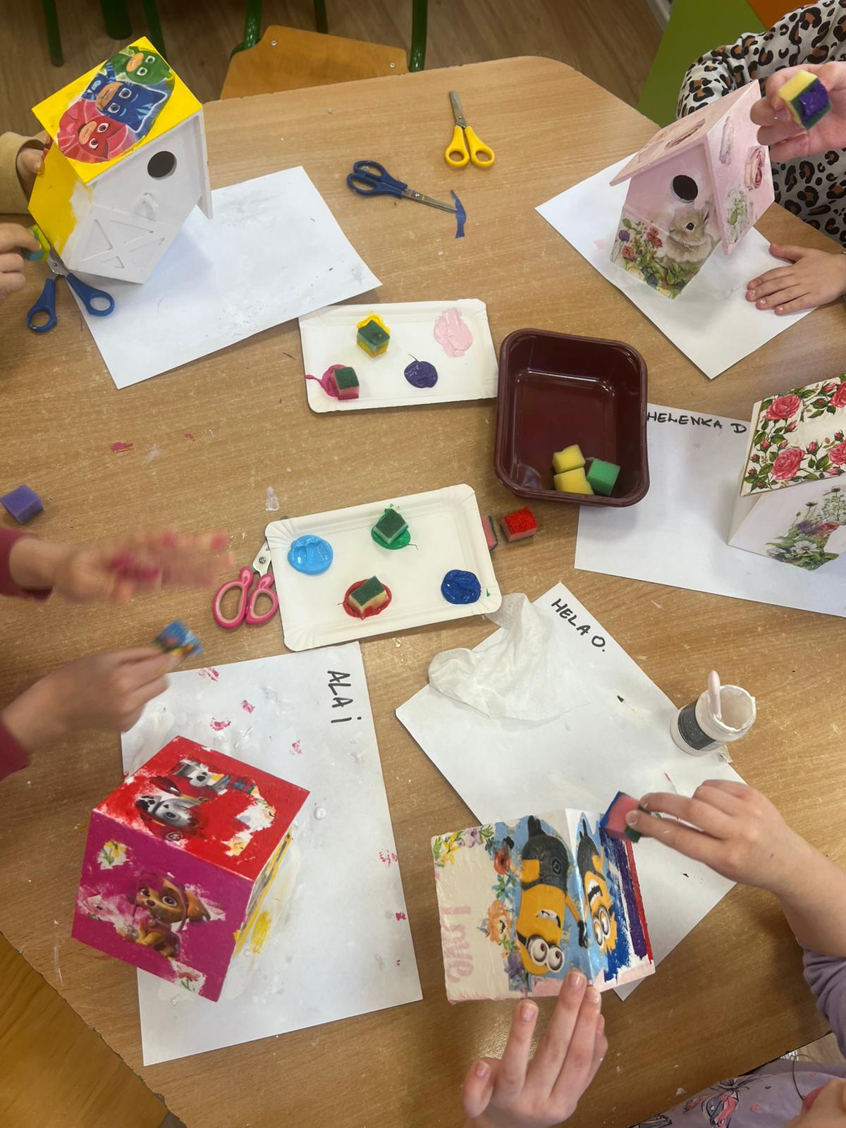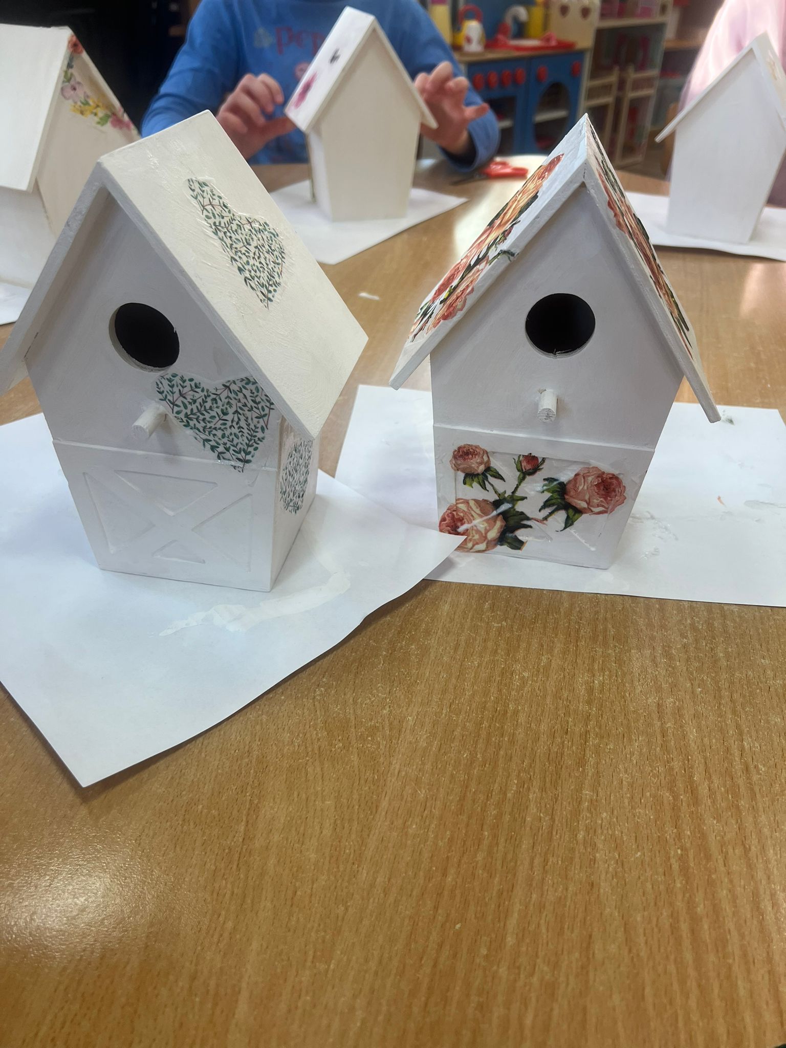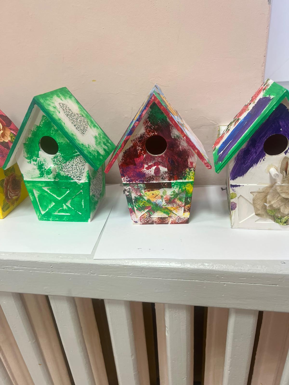 Podczas zajęć rękodzieła powstały piękne, drewniane budki dla ptaków, ozdabiane techniką decoupage 🎨🖌️ Każda z nich to małe dzieło sztuki – pełne kolorowych kwiatów, wiosennych motywów i niepowtarzalnej dziecięcej wyobraźni 🌸🌈