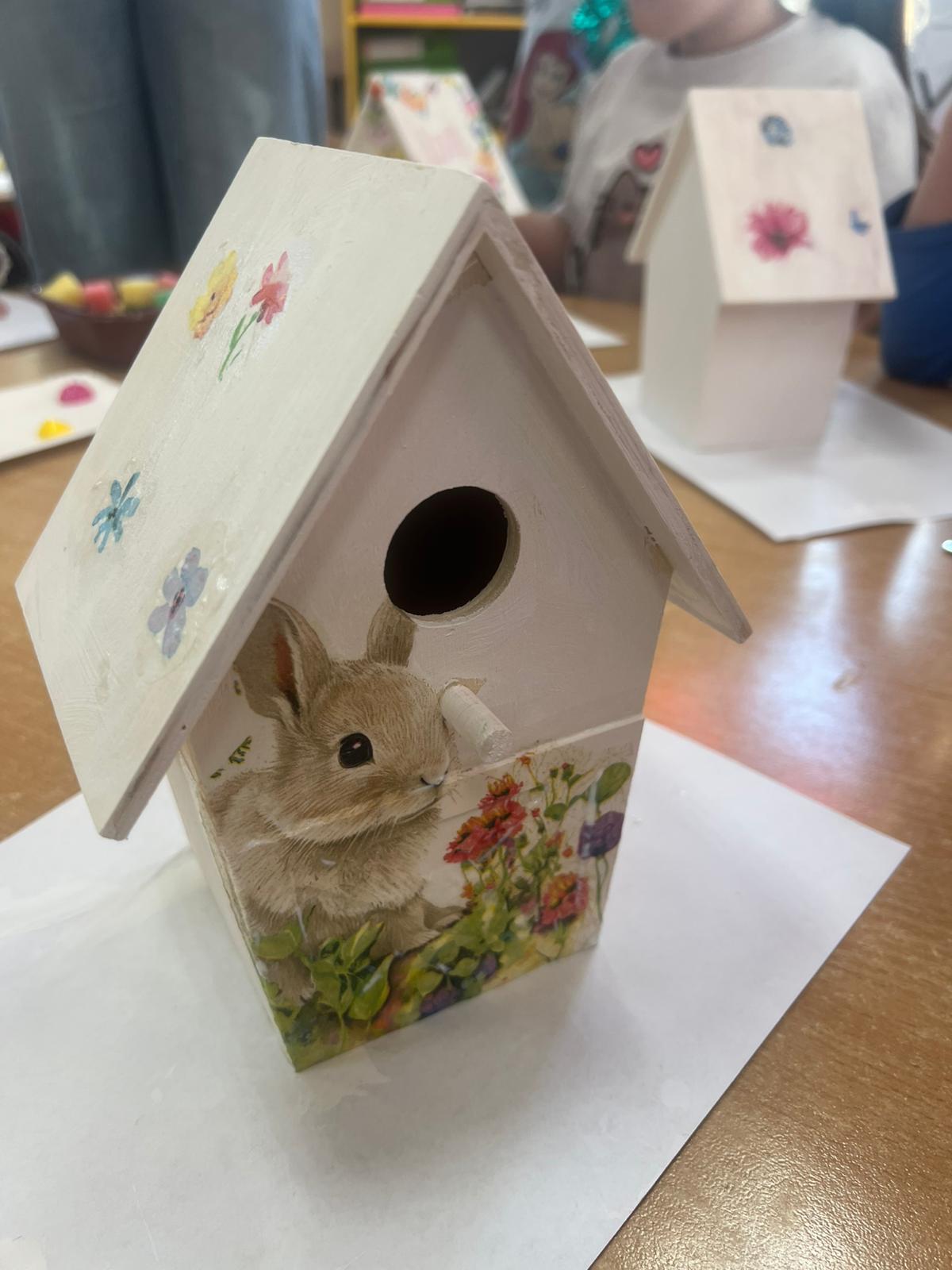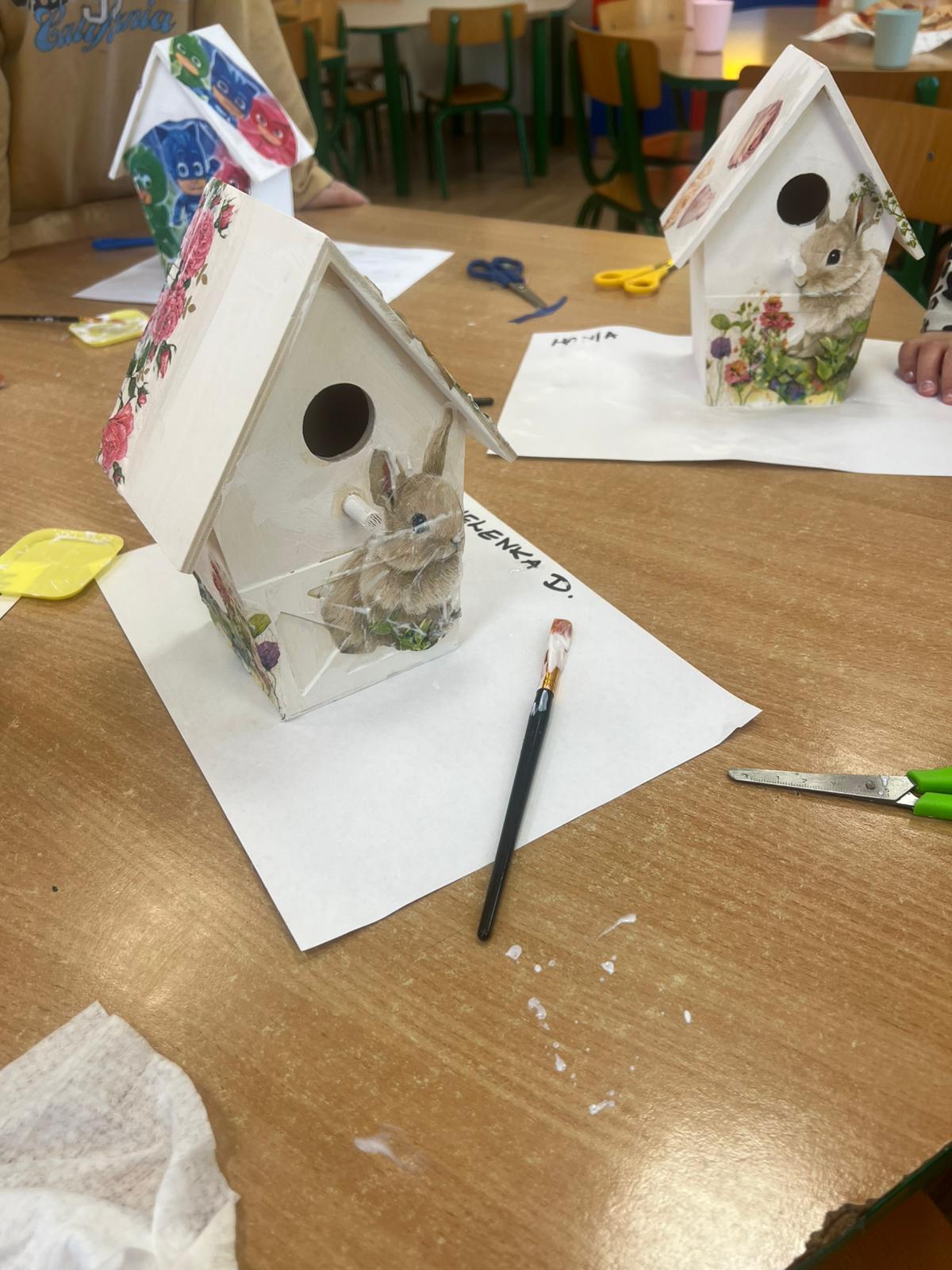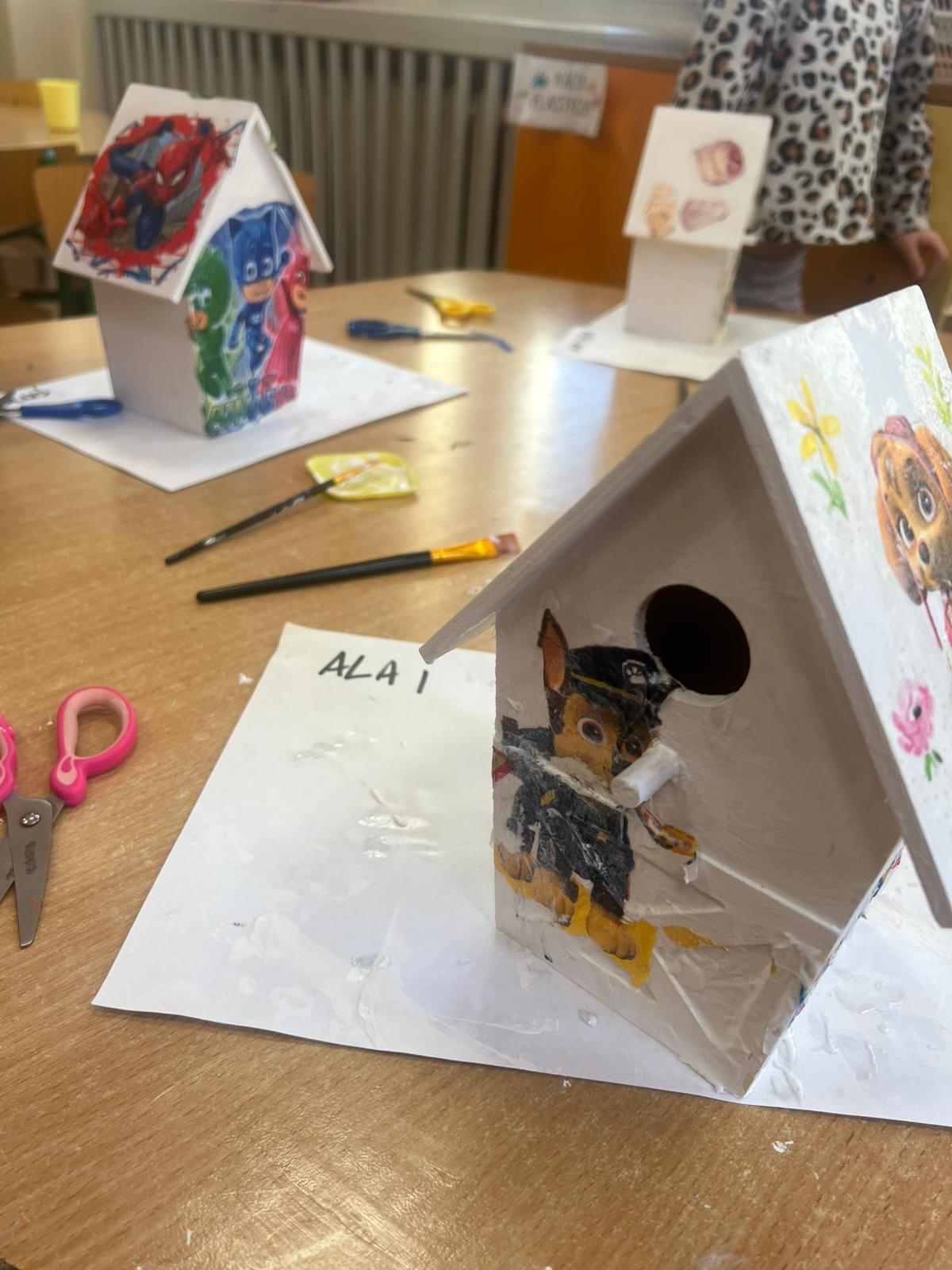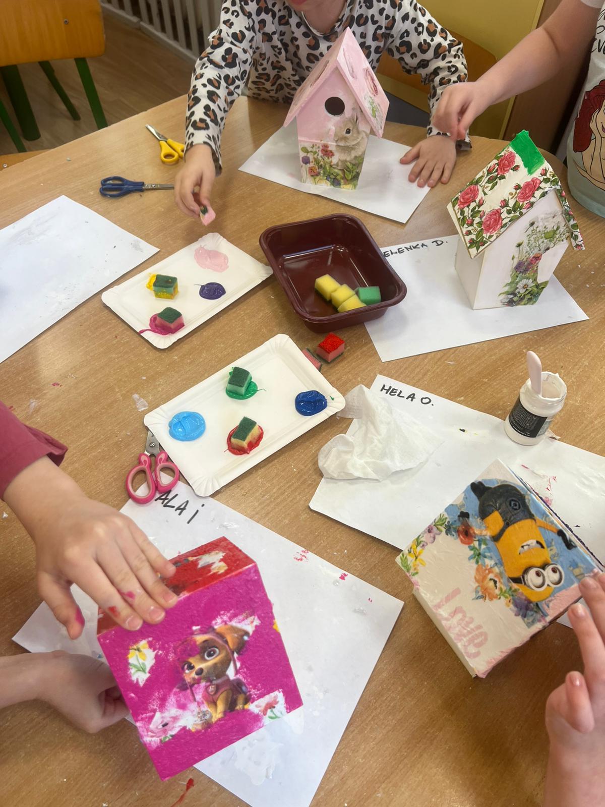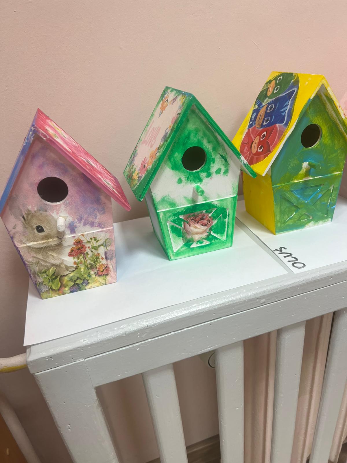 Podczas zajęć rękodzieła powstały piękne, drewniane budki dla ptaków, ozdabiane techniką decoupage 🎨🖌️ Każda z nich to małe dzieło sztuki – pełne kolorowych kwiatów, wiosennych motywów i niepowtarzalnej dziecięcej wyobraźni 🌸🌈